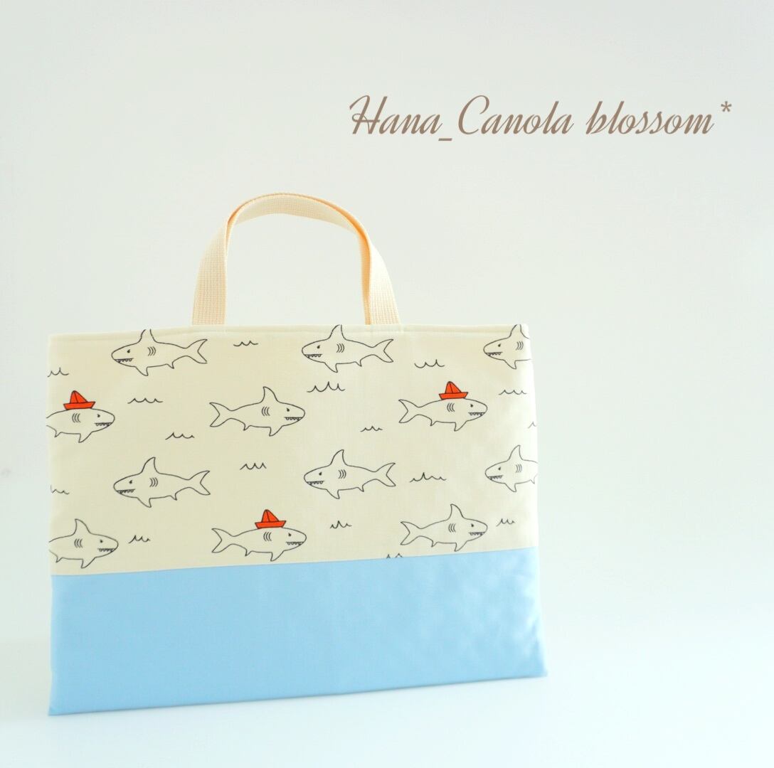 淡いサックス生地を合わせて、サメ好きな男の子のための作品をお作りいたしました。