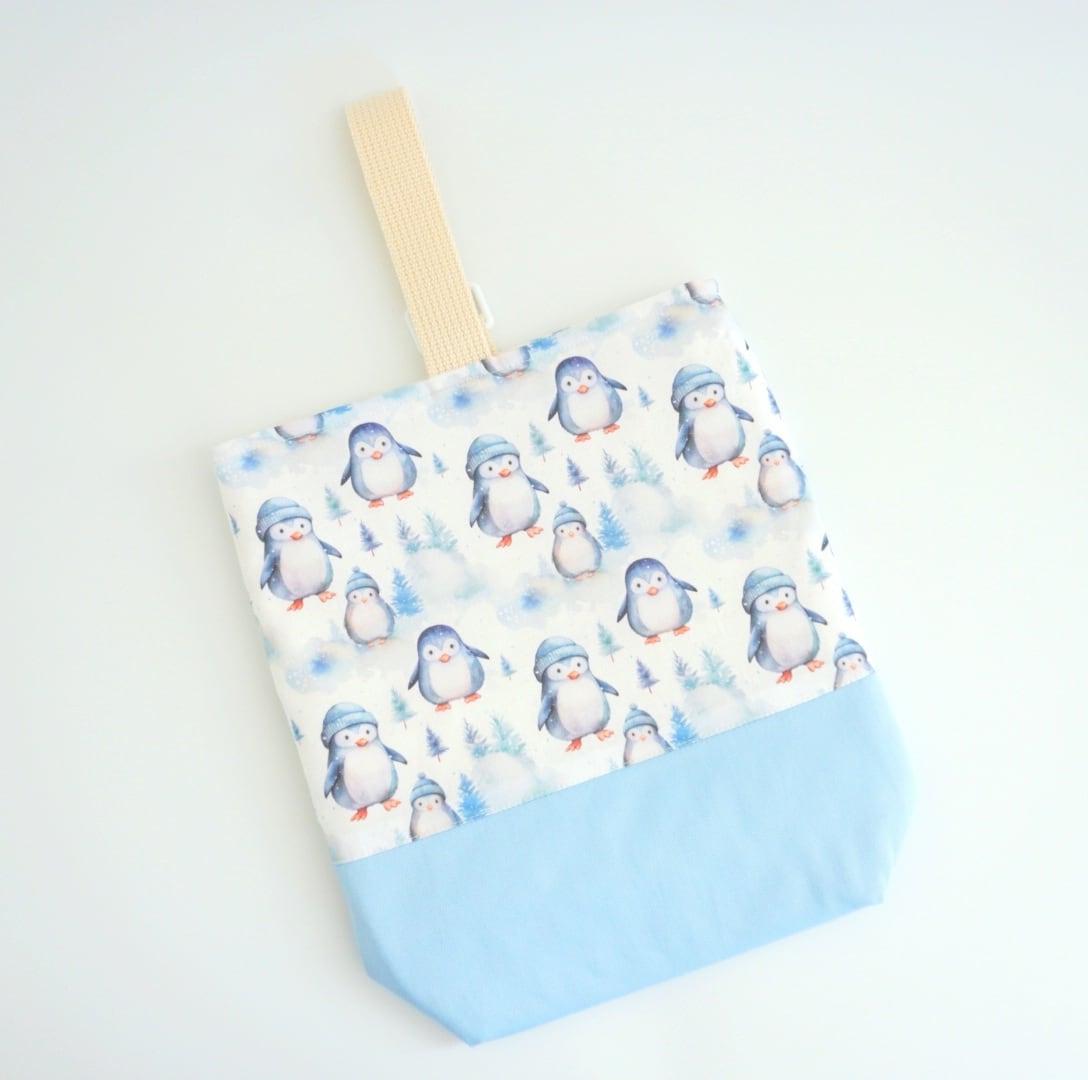かわいいペンギンたちが描かれている生地に淡いブルーの生地を合わせて、ふんわりした素敵な作品に仕上がりました。