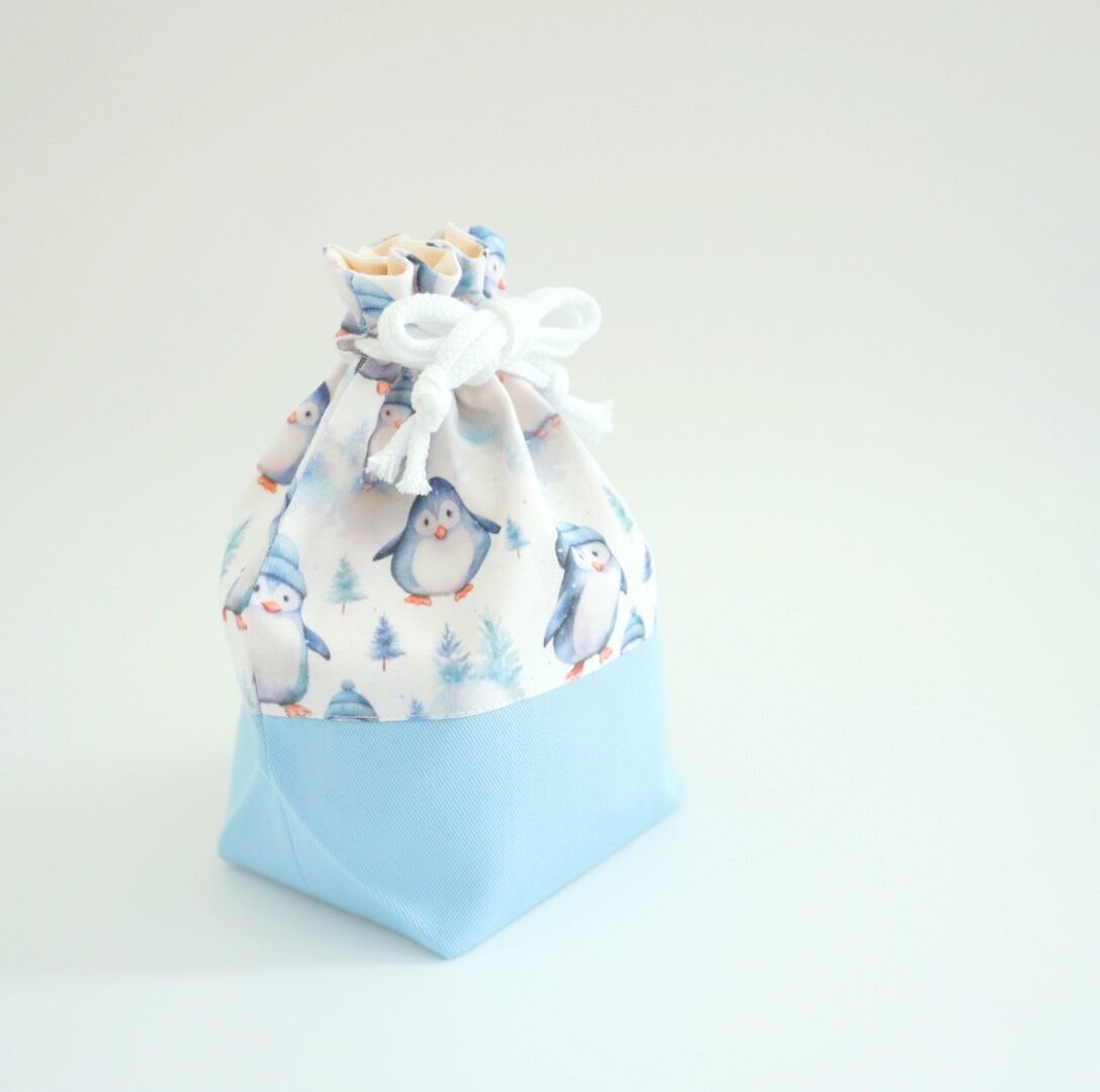 かわいいペンギンたちが描かれている生地に淡いブルーの生地を合わせて、ふんわりした素敵な作品に仕上がりました。