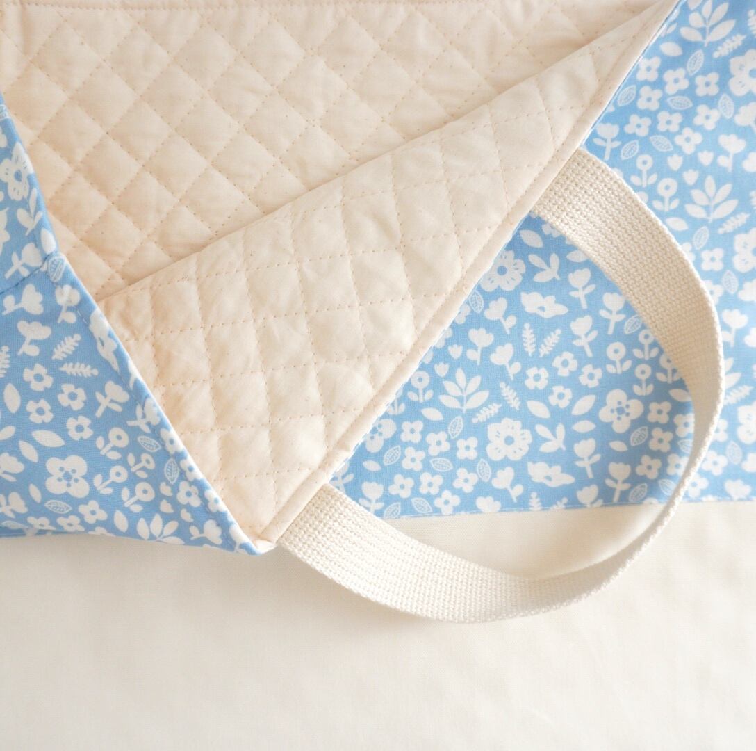 デコレクションズさんの可愛らしいスカイブルーのお花の生地にバニラの生地を合わせて、優しい色合いの作品が出来上がりました。
