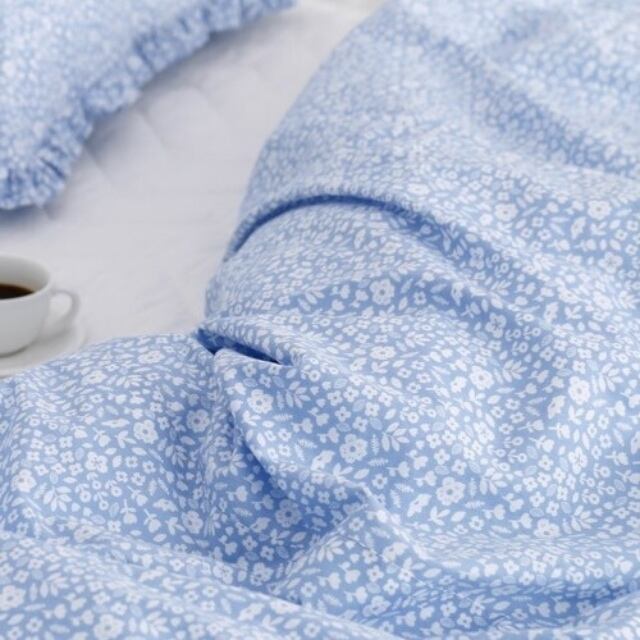 明るいスカイブルー地に白い花や葉が描かれている、ナチュラルポップなデザインです。