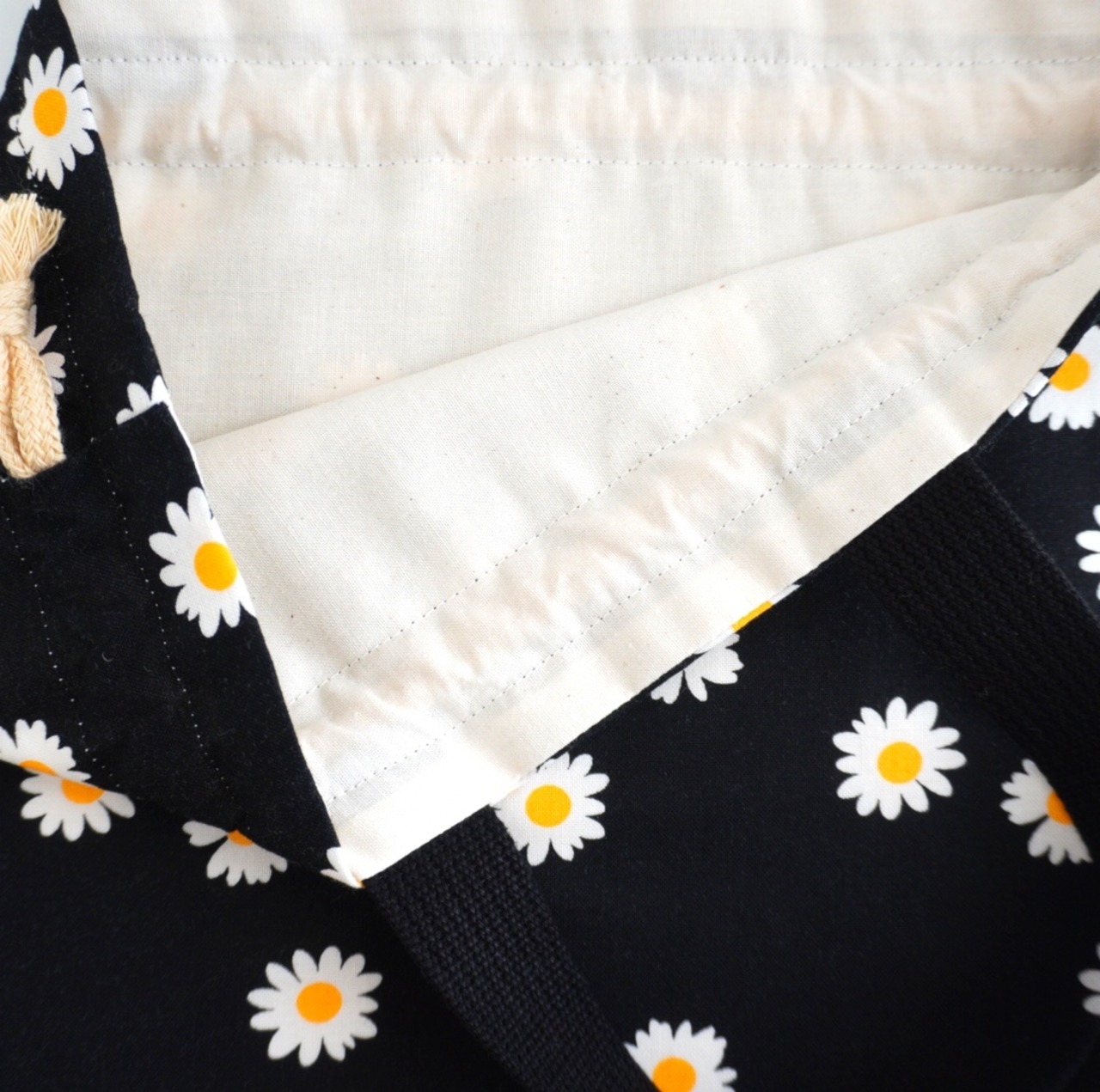 デコレクションズさんの可愛らしいデイジーのお花の生地に、カゴのデザインの生地を合わせて、