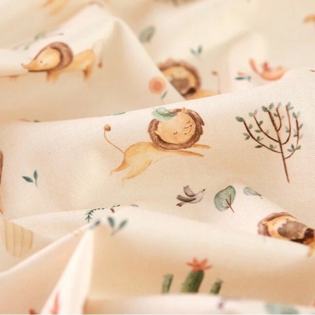 サボテンや木々の中を穏やかに過ごすライオンがやさしいタッチで描かれている素敵なデザインです。