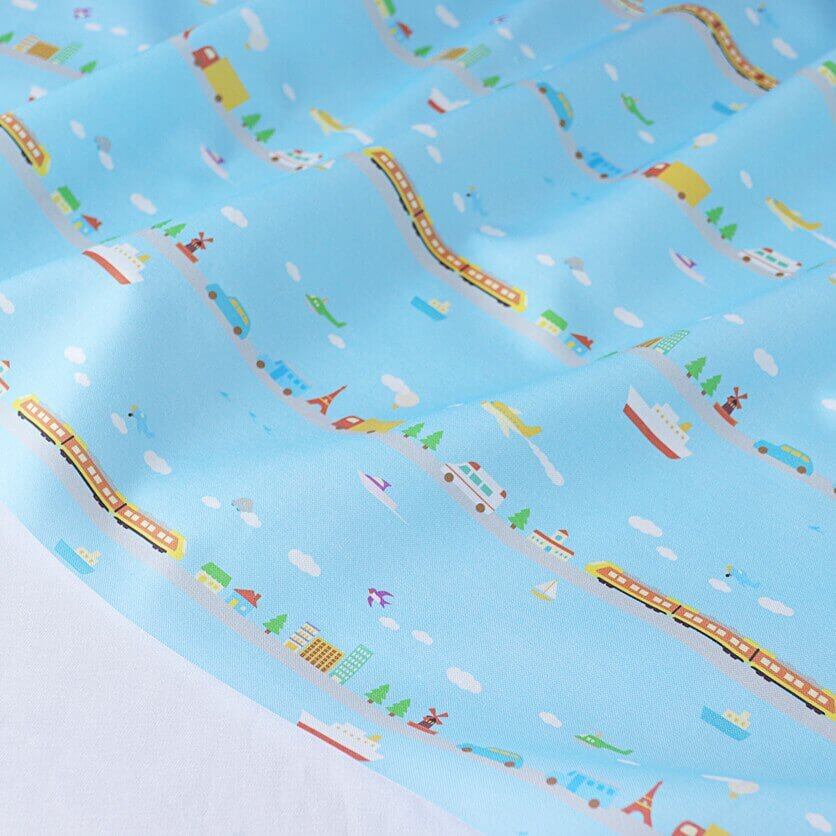 鮮やかで綺麗なスカイブルーといろんな建物や乗り物が描かれた生地にかっこいいデニム生地を合わせて、乗り物好きな男の子にぴったりの作品が仕上がりました☺︎